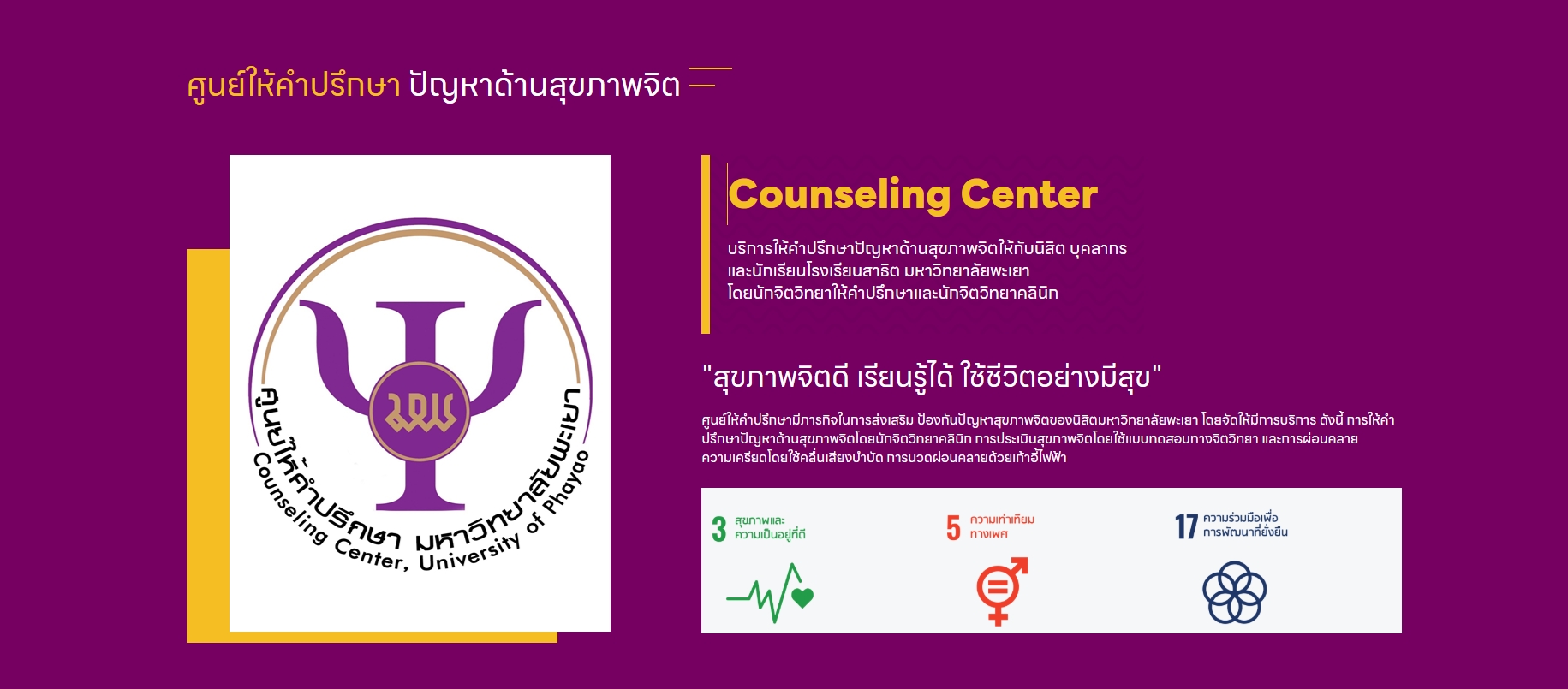 บริการให้คำปรึกษาปัญหาด้านสุขภาพจิตให้กับนิสิต บุคลากร และนักเรียนโรงเรียนสาธิต มหาวิทยาลัยพะเยาโดยนักจิตวิทยาให้คำปรึกษาและนักจิตวิทยาคลินิก ศูนย์ให้คำปรึกษามีภารกิจในการส่งเสริม ป้องกันปัญหาสุขภาพจิตของนิสิตมหาวิทยาลัยพะเยา โดยจัดให้มีการบริการ ดังนี้ การให้คำปรึกษาปัญหาด้านสุขภาพจิตโดยนักจิตวิทยาคลินิก การประเมินสุขภาพจิตโดยใช้แบบทดสอบทางจิตวิทยา และการผ่อนคลายความเครียดโดยใช้คลื่นเสียงบำบัด การนวดผ่อนคลายด้วยเก้าอี้ไฟฟ้า