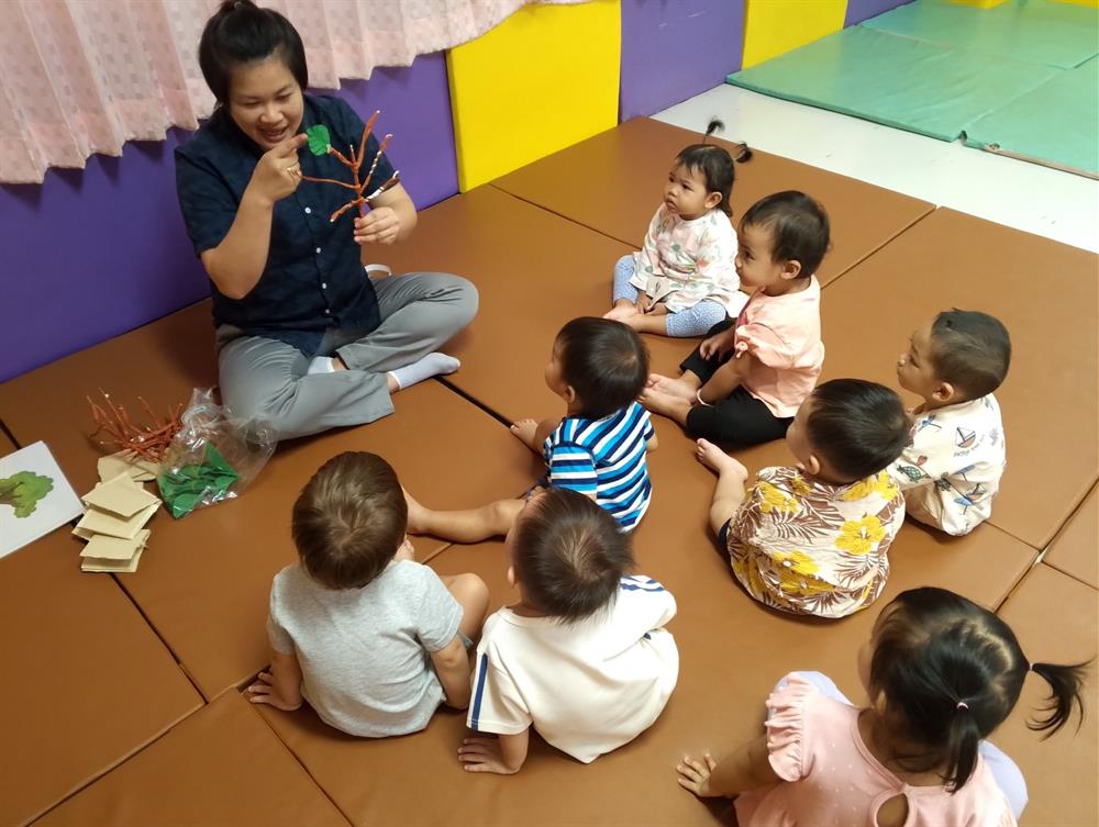 + ด้านภาษา เช่น การเล่านิทาน การพูด การออกเสียง การร้องเพลงการเรียนรู้คำศัพท์ต่างๆ การฝึกพูดคำคล้องจอง เป็นต้น